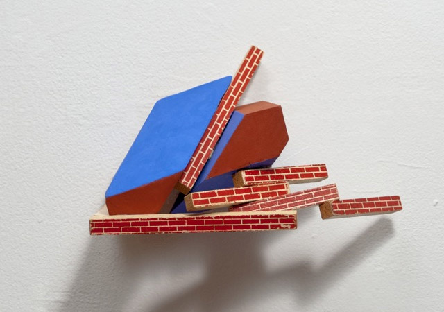 In her recent works, Tiscornia has been making discrete objects, sculptures, and collages that result from the manipulation and intervention of common tools, pieces of furniture, cardboard letters, sheet rock, insulation, and other familiar materials. These constructions and visual rearrangements of everyday objects appear both obscure and familiar. They draw upon the paradoxical bond between architecture – a language of construction par excellence – with that of destruction and dislocation.