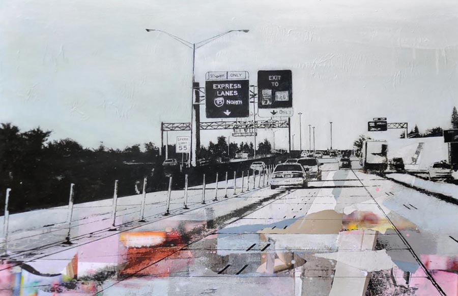 Marina Gonella’s work explores how place affects our concept of identity. Our surroundings alter our actions, thoughts and way of life. Gonella’s pieces become a tangible and personal interpretation of her awareness of these surroundings. In her latest series, the images reflect her daily commute, driving a car presents a different way of experiencing the city than as a pedestrian. Her creative process starts with the manipulation of her own photographs depicting urban landscapes. Using transfers and abstract collage, she establishes a new relationship between her and the location. In this juncture of texture, material and color, Gonella displaces different elements and rearranges them into a new reality.