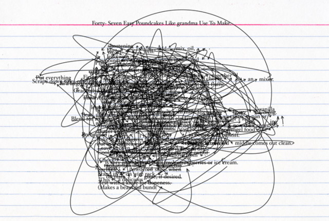 Nyeema Morgan’s interdisciplinary work “explores the personal and cultural economy of knowledge through familiar artifacts.” Ten works from her series titled “Forty-Seven Easy Poundcakes Like grandma Use To Make” uses a rule-based drawing process to sequentially edit forty-seven variations on an “easy pound cake” recipe culled from Google searches. Morgan employs hand-drawn digital processes to ultimately produce small digital works that replace and negate ordinary instructions. Morgan, a graduate of the Cooper Union School of Art and California College of the Arts, is based in New York. She has been a resident artist at Abrons Art Center, Aljira: A Center for Contemporary Art as well as attending the Skowhegan School of Painting and Sculpture. She has exhibited her works at Artspace, New Haven, CT; Art in General, New York, NY; Galerie Jeanroch Dard, Paris; The Bindery Projects, St. Paul, MN and the South Hill Park Arts Centre, Bracknell, UK. Â