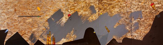 Robert Huff’s abstract landscapes are created with building materials and references to architecture and man-make structures. The surfaces of the constructions are oriented strand board (OBS) that has been covered with multiple layers of heavy acrylic paint which is then carefully sanded and stripped to reveal subtle colors, textures and patterns. Flat coal black chalkboard paint areas make a stark contrast to this organic surface and provide another surface for Huff’s delicate drawing. Along with the paintings, a small bronze sculpture will also be presented.