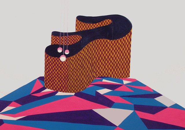 Michelle Weinberg’s flattened painted spaces evoke modernized Japanese prints and beautifully wrought virtual worlds, pre-3-D. Her pieces for this exhibition are medium-sized works on paper. Their gem-like colors and tightly patterned compositions relate to her concerns with social architecture. Her murals at Miami Art Museum (2010) and Locust Projects (2009) actively engaged the milieu of Wynwood warehouses and sign painting in Miami. In doing so, she sought to camouflage the edifices while also playing with forms and signifiers. She cites Andrea Branzi, who suggested that in India, for example, architecture is “a fluctuating, decorated surface which acts as a kind of mental representation.” Presently, her public projects apply a visual activism. For a project in front of the Tampa Museum of Art, Weinberg will replace bland crosswalk stripes with a colorful play of forms.