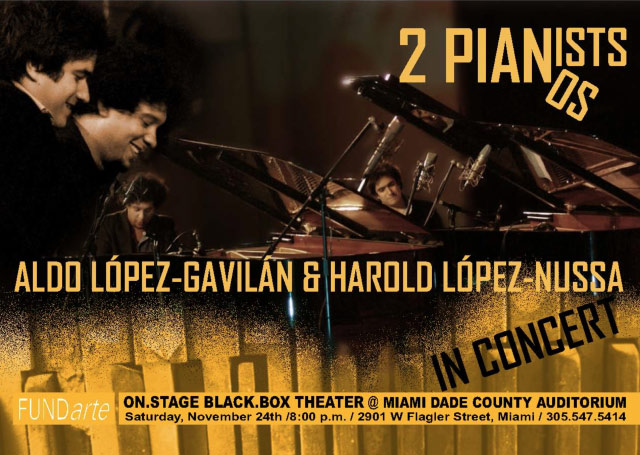 FUNDarte is presenting Cuban Pianists Aldo López-Gavilán and Harold López-Nussa in concert at the On Stage Black Box Theater at Miami-Dade County Auditorium. Virtuosity, innovation, and originality are how audiences and critics describe the two young talents that are taking the classical and jazz music worlds by storm. Both accomplished and award-winning soloists in their own right, these two Cuban maverick pianists will be playing one rare engagement together in Miami.