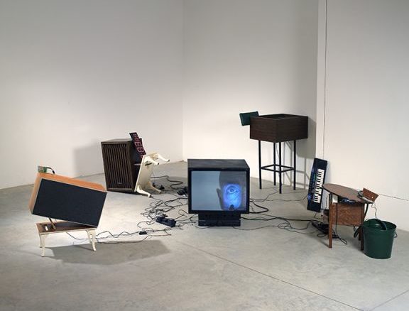 Haroon Mirza (b. 1977, London) is a multimedia artist who works with audiovisual materials, electronic equipment, amplifiers, and found objects to create immersive environments and kinetic sculptures. His work amplifies phenomena that are often imperceptible –such as electricity–and seeks to create or distort the relationship between optics and acoustics, giving unexpected visual and sensorial analogs to what we hear. Mirza uses a particular visual and material vocabulary to modify architectural spaces, including colored neon and sculptural acoustic foam, creating installations that offer a precise, highly mediated experience of sound and light.