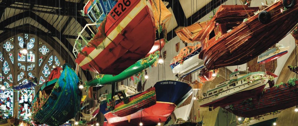For Those in Peril on the Sea (2011) is an installation by artist Hew Locke, first shown in 2013 during PAMM’s inaugural programming. Consisting of dozens of scaled-down replicas of ships suspended from the ceiling, the installation creates the impression of a massive exodus taking place throughout the architectural space above the viewer. It features a broad range of vessel types, from cigarette boats, catamarans, and cruise liners to ragged fishing skiffs and timeworn cargo ships.