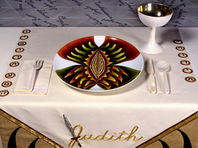 Judy Chicago is well known for her work called The Dinner Party (1974-79). The installation is made of a massive ceremonial banquet, arranged on a triangular table with a total of thirty-nine place settings, each commemorating an important woman from history.