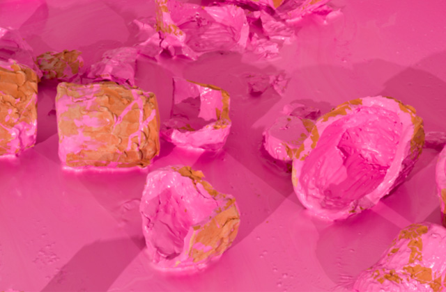 Black bowls containing hot pink paint occupy an expedit shelving unit like larvae in a honeycomb or circles in Kandinsky’s grid. As Gilmore wedges a rock into each bowl, some violently burst, others overflow into Cy Twombly’s gestural script. In the singular performance Rock, Hard, Place (2012), Gilmore’s corporeal agency within environmental construct blurs the line between set design and mark making. Rock, Hard, Place is exhibited as sculpture, video, and photography.