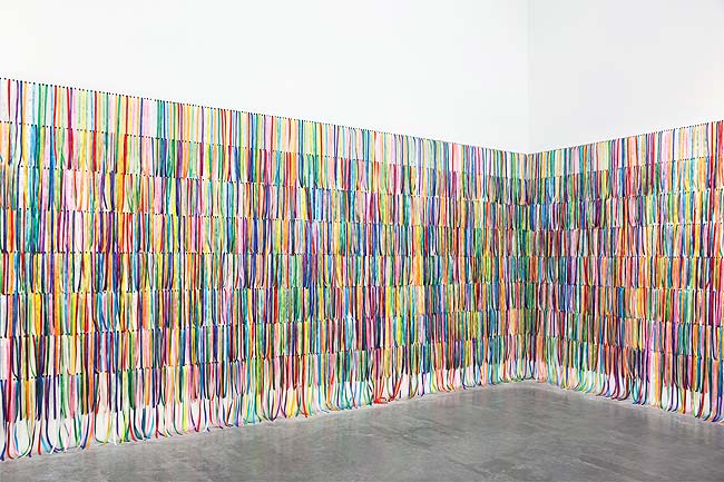 The show at MAM’s plaza-level gallery, includes two of Neuenschwander’s installations, Rain Rains and I Wish Your Wish. Rain Rains is an environment of dripping buckets, suspended from the ceiling to create an artificial rain environment. I Wish Your Wish is inspired by a tradition of a church in Bahia, Brazil, in which the faithful bind ribbons to their wrists and to the gates of the church; according to tradition, their wishes are granted when the ribbons wear away and fall off. In Neuenschwander’s version, visitors choose from thousands of ribbons printed with the wishes from past visitors to the installation and replace them with wishes of their own, turning private aspiration into collective responsibility.