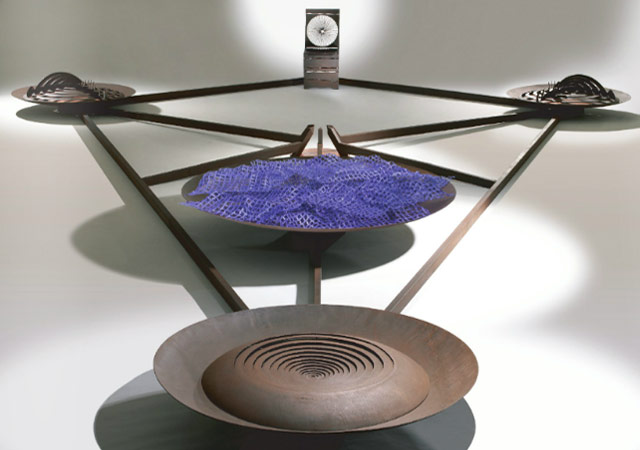 Her installation for the Frost Art Museum calls for the viewer to momentarily suspend the demands of the everyday to interact on an emotional basis with the sculptural forms. The large-scale, site-specific work is multi-media and constructed out of different types of steel and projections to produce a confrontation with the materials, potentially extend the human experience beyond that of the merely functional or obvious, and enter into a relationship directed at perception and personal response. According to the artist, “This exhibition is about the cosmos, Sacred Geometry, the unknown, the mysterious and the magical.” Out of the Ordinary Geometry was curated by Rebeca Schapiro.
