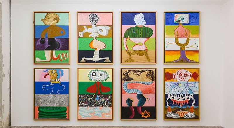 Ray Smith Studio features a series of 29 ‘exquisite corpse’ paintings produced by Ray, Nik, Eamon and Keegan. This process was famously used by André Breton and the Surrealists, though it originally hails from a 19th century parlor game. The paintings depict fragmented and seamed figures, often shown in distorted poses, possessing caricature-like qualities. Also on view is a Table Drawing from the same period. The final work produced for the show, is a wood sculpture created in Miami by Ray and Emmett.