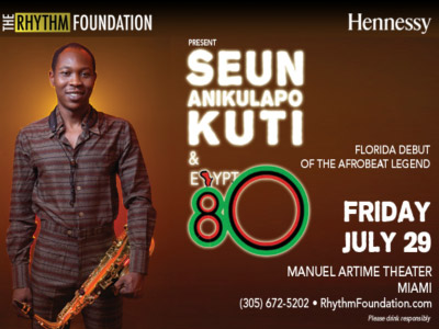 Archetypal Afrobeat comes to Miami with Fela’s legendary band Egypt 80, led by Seun Kuti. With his new release and recent world tours, Seun Anikulapo Kuti picks up the mantle as undisputed champion and true prince of the Afrobeat movement,