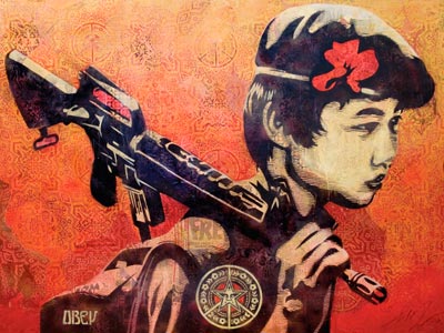 Shepard Fairey is one of the most visible and celebrated artists of his generation. Fairey first gained notoriety by translating pop culture imagery into guerilla propaganda campaigns that quickly became global phenomena, most prominently with his ubiquitous “Obey” images. Fairey’s recent work consists of complex, multi-layered portraits of counter-cultural revolutionary figures combined with politically-charged propaganda style imagery. Fairey’s image of Barack Obama propelled him toward widespread international acclaim when the stylized portrait of the presidential candidate with the word “Hope” became the most recognizable image of the 2008 elections and a survey exhibition of his work was organized at the ICA Boston in early 2009.